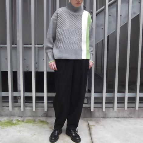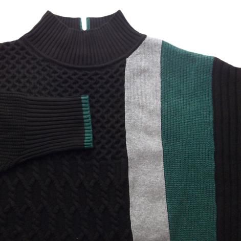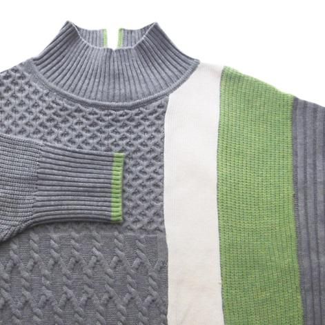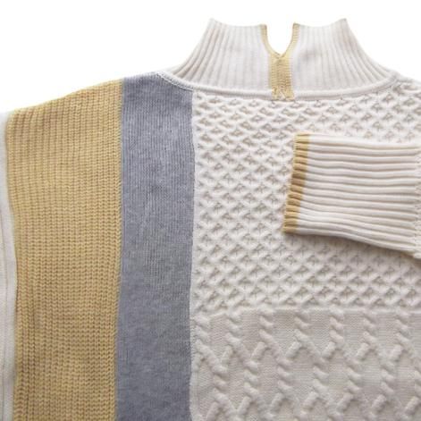 キャッチーな3色カラーと様々な編み地がミックスになっておりコーディネートを華やかに見せてくれます。程よくゆるいハイネックで、ネックの後ろの差し色がポイント。ボックスシルエットでこなれ感があり、色々なボトムでコーディネートしていただけます。手洗い可能。着用スタッフ身長160cm