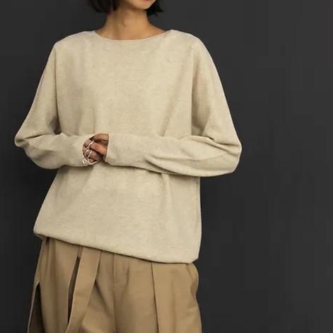 程よい開きのラウンドネックニットは首元を綺麗に見せ、余りの出るサイズ感で華奢見えします。ホールガーメントで縫い目なく編み立てられており、着心地の良さも抜群。素材の良さを引き立てるミニマムなデザインで色違いで揃えたくなるニットです。手洗い可能。